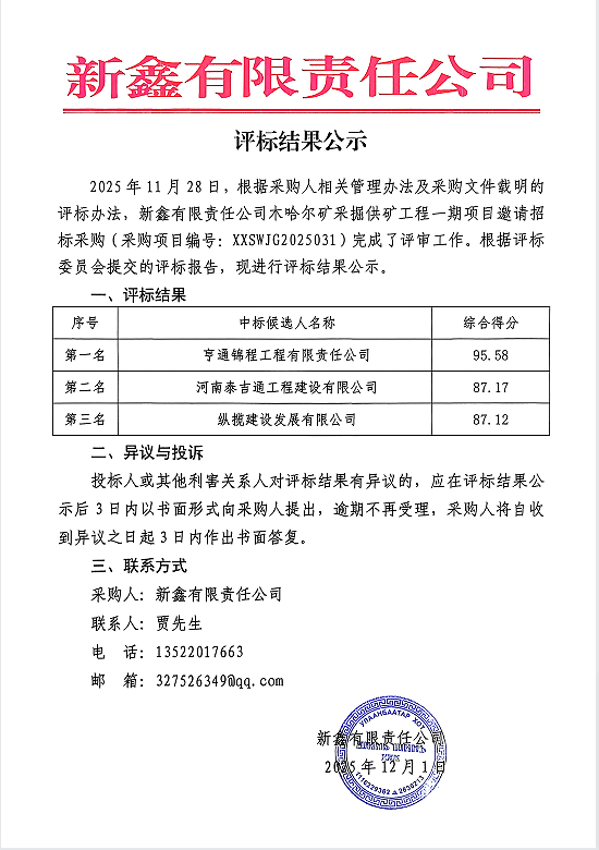 新鑫有限责任公司木哈尔矿采掘供矿工程一期项目评标结果公示
