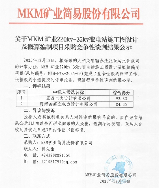 MKM 矿业220kv-35kv变电站施工图设计及概算编制项目竞争性谈判结果公示