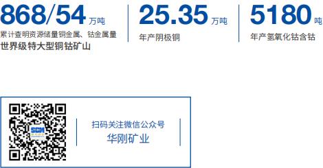 华刚矿业所属铜钴矿由6个矿段组成,矿区面积约 11.05 平方公里,矿石储 量约 2.5 亿吨,铜矿石品位 3.47%,钴矿石品位 0.215%,探明金属资源储量含铜 868 万吨、含钴 54 万吨,是世界级特大铜钴矿山。